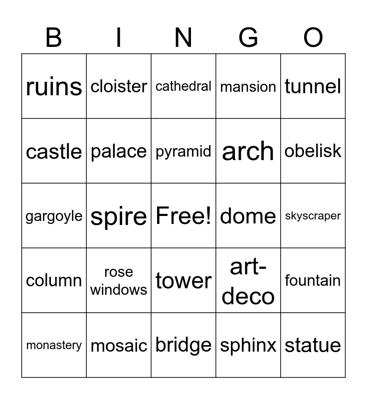 This bingo card has a free space and 27 words: art-deco, aqueduct, arch, bridge, castle, cathedral, cloister, column, dome, fountain, gargoyle, mansion, monastery, mosaic, obelisk, pagoda, palace, pyramid, rose windows, ruins, skyscraper, sphinx, spire, statue, tower, tunnel and wall.