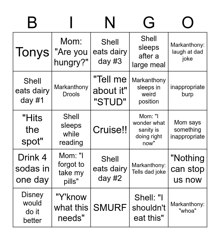 This bingo card has a free space and 24 words: Mom: "I forgot to take my pills", "Y'know what this needs", "Tell me about it" "STUD", Disney would do it better, Markanthony: laugh at dad joke, Tonys, Shell eats dairy day #1, Mom: "Are you hungry?", Mom: "I wonder what sanity is doing right now", Shell eats dairy day #2, Markanthony sleeps in weird position, "Hits the spot", Markanthony: Tells dad joke, "Nothing can stop us now, Markanthony Drools, Shell: "I shouldn't eat this", Mom says something inappropriate, Shell eats dairy day #3, inappropriate burp, Shell sleeps while reading, Markanthony: "whoa", Drink 4 sodas in one day, Shell sleeps after a large meal and SMURF.