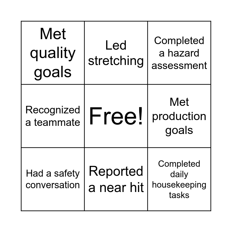 This bingo card has a free space and 8 words: Met production goals, Completed a hazard assessment, Led stretching, Had a safety conversation, Met quality goals, Completed daily housekeeping tasks, Recognized a teammate and Reported a near hit.