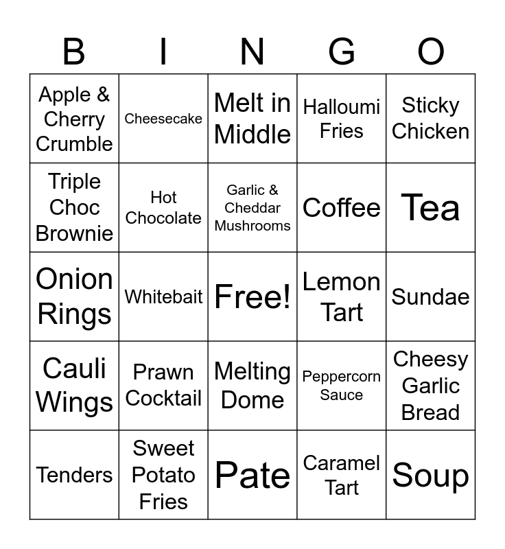 This bingo card has a free space and 25 words: Prawn Cocktail, Pate, Garlic & Cheddar Mushrooms, Tenders, Sticky Chicken, Apple & Cherry Crumble, Triple Choc Brownie, Cheesecake, Lemon Tart, Melting Dome, Coffee, Onion Rings, Peppercorn Sauce, Cheesy Garlic Bread, Hot Chocolate, Cocktail, Sundae, Melt in Middle, Tea, Whitebait, Soup, Sweet Potato Fries, Cauli Wings, Halloumi Fries and Caramel Tart.