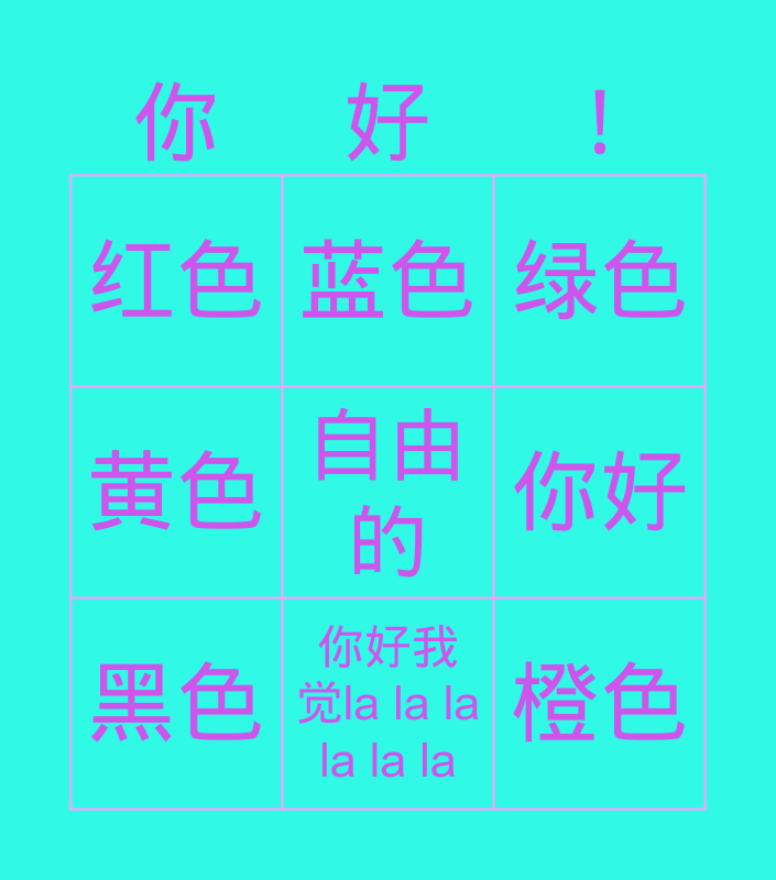 This bingo card has a free space and 8 words: 你好, 绿色, 蓝色, 黑色, 红色, 橙色, 黄色 and 你好我觉la la la la la la.
