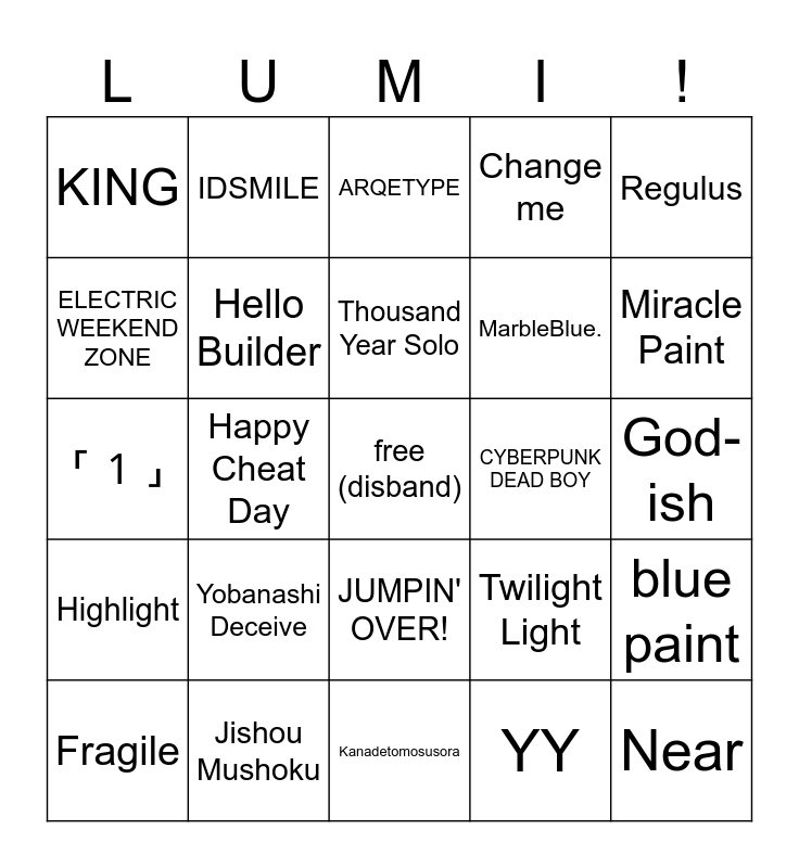 This bingo card has a free space and 24 words: Yobanashi Deceive, Jishou Mushoku, Thousand Year Solo, Fragile, Regulus, KING, ELECTRIC WEEKEND ZONE, IDSMILE, CYBERPUNK DEAD BOY, JUMPIN' OVER!, MarbleBlue., 「1」, Twilight Light, blue paint, Hello Builder, YY, God-ish, ARQETYPE, Miracle Paint, Happy Cheat Day, Near, Highlight, Change me and Kanadetomosusora.