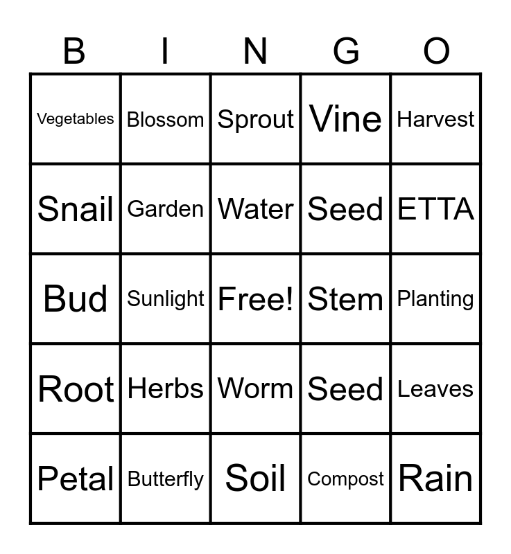 This bingo card has a free space and 27 words: Seed, Bee, Seed, Soil, Snail, Sprout, Blossom, Root, Stem, Leaves, Bud, Vine, Petal, Butterfly, ETTA, Friends, Garden, Water, Herbs, Vegetables, Planting, Compost, Sunlight, Rain, Worm, Harvest and Ladybug.