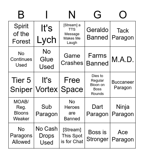This bingo card has a free space and 72 words: It's Bloonarius, It's Lych, It's Vortex, It's Dreadbloon, It's Blastapopalous, It's Phayze, Geraldo Banned, Benjamin Banned, Farms Banned, Limited Farms, No Paragons Allowed, Limited Number of Towers Placed at a Time, M.A.D., Spirit of the Forest, Tack Zone, Tier 5 Sniper, Dart Paragon, Tack Paragon, Boomer Paragon, Buccaneer Paragon, Sub Paragon, Ace Paragon, Ninja Paragon, VTSG, Wizard Paragon, Engineer Paragon, It's a Beginner Map, It's an Intermediate Map, It's an Expert Map, It's an Advanced Map, No Cash Drops Used, Boss is Unmodified, Boss is Faster, Boss is Slower, Boss is Stronger, Boss is Weaker, Easy Boss, Brutal Boss, No Continues Used, 4 Heroes or Less are Allowed, No Heroes are Banned, MOAB/ Reg. Bloons No Modifiers, MOAB/ Reg. Bloons Faster, MOAB/ Reg. Bloons Slower, MOAB/ Reg. Bloons Stronger, MOAB/ Reg. Bloons Weaker, Someone is Streaming the Game, No Insta Monkeys Used, Tier 5 Farm Before Round 65, Paragon By Tier 3, 70+ Degree Paragon, Dies to Boss, Dies to Normal Round, Dies to Regular Bloon on Boss Rounds, Runs out of Rounds Before Boss Exits, Best Tower Gets Stunned and You Lose, [Stream] a TTS Message Makes Me Laugh, Game Crashes, [Co-op] Another Player's Game Crashes, Rage Quit, [Co-op] One Player Carries, Sells Everything to Afford Defense to beat Tier 4 or Under, Degree 1 Paragon, [Stream] This Spot is for Chat, Retrying a Tier More than 3 Times, One Tower Beats a Tier, No Glue Used, The Same Tower Solos 2 Tiers, Accidently Buys Wrong Crosspath, No Hero Gets Placed, Dies to Tier 1 and Dies Before Tier 1.