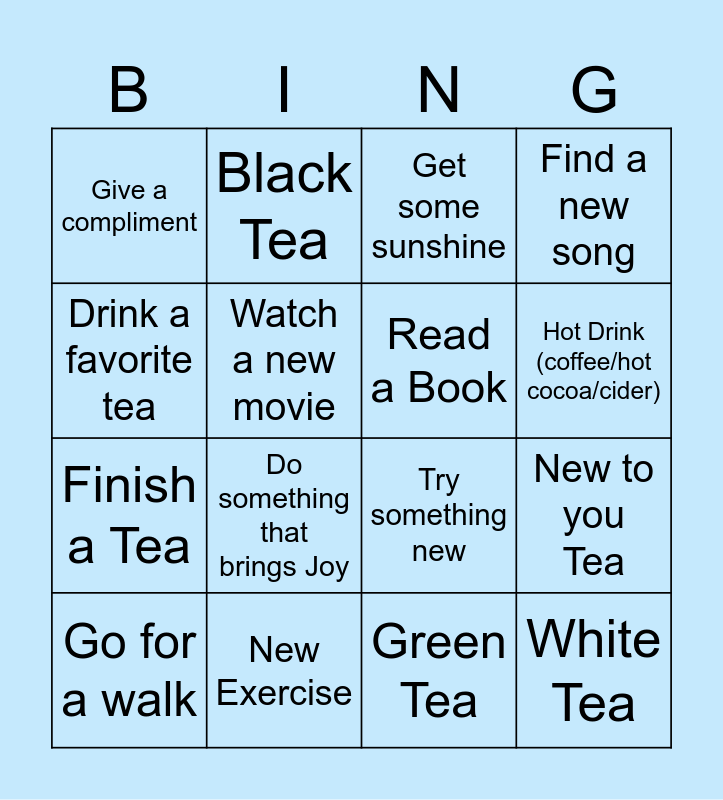 This bingo card has 16 words: New Exercise, New to you Tea, Get some sunshine, Give a compliment, Finish a Tea, Black Tea, Try something new, Green Tea, Drink a favorite tea, Watch a new movie, Go for a walk, Find a new song, Do something that brings Joy, Hot Drink (coffee/hot cocoa/cider), Read a Book and White Tea.