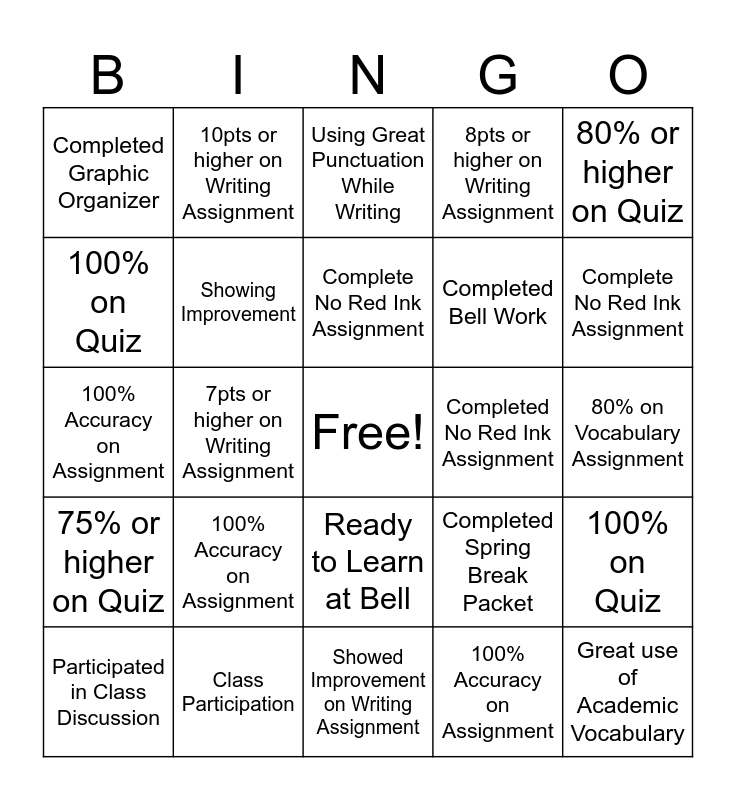 This bingo card has a free space and 25 words: 100% Accuracy on Assignment, Showed Improvement on Writing Assignment, Complete No Red Ink Assignment, Participated in Class Discussion, 80% or higher on Quiz, Completed Graphic Organizer, 100% on Quiz, 10pts or higher on Writing Assignment, Completed No Red Ink Assignment, Ready to Learn at Bell, Completed Bell Work, 100% Accuracy on Assignment, Completed Spring Break Packet, 100% on Quiz, Showing Improvement, 100% on Monthly Assessment, 80% on Vocabulary Assignment, Using Great Punctuation While Writing, Complete No Red Ink Assignment, 7pts or higher on Writing Assignment, Great use of Academic Vocabulary, Class Participation, 75% or higher on Quiz, 8pts or higher on Writing Assignment and 100% Accuracy on Assignment.