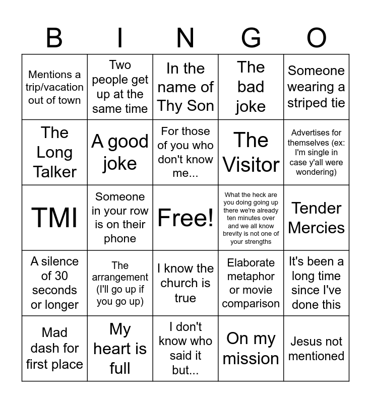 This bingo card has a free space and 32 words: On my mission, Temple, Someone in your row is on their phone, Dating, A silence of 30 seconds or longer, A good joke, Someone wearing a striped tie, It's been a long time since I've done this, Two people get up at the same time, Someone quotes a general authority, For those of you who don't know me..., In the name of Thy Son, Member of the bishopric falls asleep, I didn't want to, but I felt I had to come up, What the heck are you doing going up there we're already ten minutes over and we all know brevity is not one of your strengths, The Regular, Mad dash for first place, TMI, I know the church is true, The arrangement (I'll go up if you go up), Elaborate metaphor or movie comparison, "transplant", Tender Mercies, My heart is full, Jesus not mentioned, The bad joke, The Visitor, The Long Talker, Mentions a trip/vacation out of town, I don't know who said it but..., Crying and Advertises for themselves (ex: I'm single in case y'all were wondering).