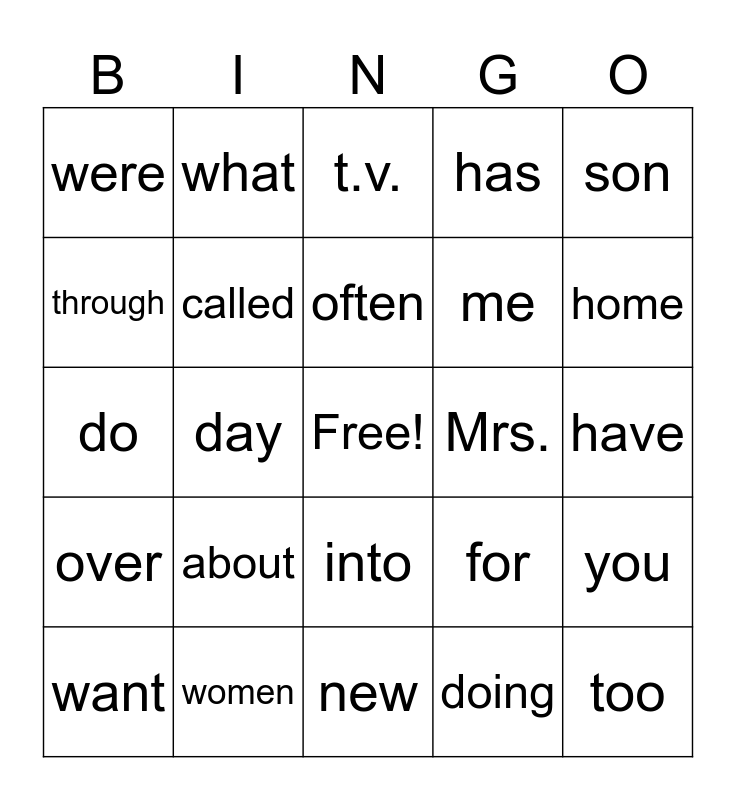 This bingo card has a free space and 26 words: into, doing, often, women, son, were, through, what, have, for, me, do, you, want, day, are, has, over, t.v., too, home, new, Mrs., about, called and be.