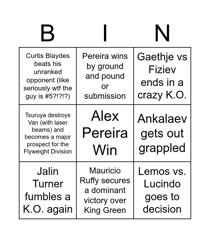 This bingo card has a free space and 8 words: Ankalaev gets out grappled, Gaethje vs Fiziev ends in a crazy K.O., Pereira wins by ground and pound or submission, Jalin Turner fumbles a K.O. again, Curtis Blaydes beats his unranked opponent (like seriously wtf the guy is #5?!?!?), Lemos vs. Lucindo goes to decision, Tsuruya destroys Van (with laser beams) and becomes a major prospect for the Flyweight Division and Mauricio Ruffy secures a dominant victory over King Green.