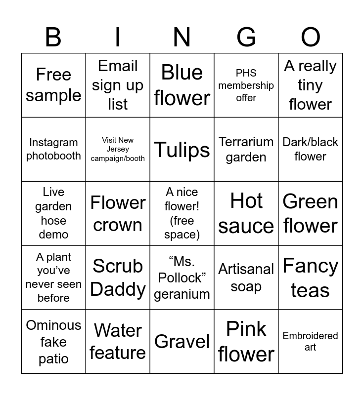 This bingo card has a free space and 24 words: Scrub Daddy, Water feature, Tulips, Ominous fake patio, A really tiny flower, Free sample, Instagram photobooth, Email sign up list, Hot sauce, “Ms. Pollock” geranium, Terrarium garden, Live garden hose demo, Artisanal soap, Fancy teas, Visit New Jersey campaign/booth, Pink flower, Green flower, Blue flower, Dark/black flower, Flower crown, Embroidered art, A plant you’ve never seen before, PHS membership offer and Gravel.