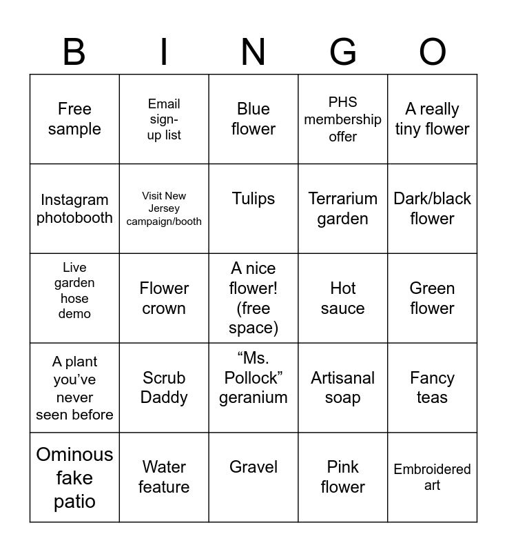 This bingo card has a free space and 24 words: Scrub Daddy, Water feature, Tulips, Ominous fake patio, A really tiny flower, Free sample, Instagram photobooth, Email sign- up list, Hot sauce, “Ms. Pollock” geranium, Terrarium garden, Live garden hose demo, Artisanal soap, Fancy teas, Visit New Jersey campaign/booth, Pink flower, Green flower, Blue flower, Dark/black flower, Flower crown, Embroidered art, A plant you’ve never seen before, PHS membership offer and Gravel.