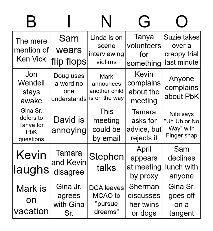 This bingo card has a free space and 24 words: Tamara and Kevin disagree, Gina Jr. agrees with Gina Sr., Mark announces another child is on the way, Mark is on vacation, Suzie takes over a crappy trial last minute, The mere mention of Ken Vick, Jon Wendell stays awake, Sam wears flip flops, Tamara asks for advice, but rejects it, Stephen talks, Kevin complains about the meeting, Gina Sr. defers to Tanya for PbK questions, April appears at meeting by proxy, Sam declines lunch with anyone, Doug uses a word no one understands, Sherman discusses her twins or dogs, Nife says "Uh Uh or No Way" with Finger snap, Linda is on scene interviewing victims, Anyone complains about PbK, David is annoying, Gina Sr. goes off on a tangent, Kevin laughs, Tanya volunteers for something and DCA leaves MCAO to "pursue dreams".