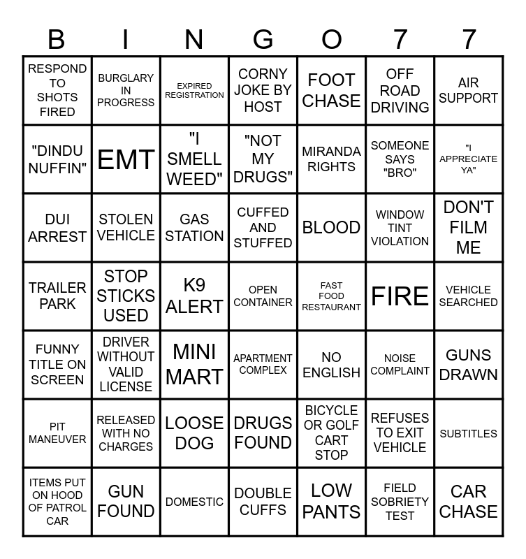 This bingo card has 56 words: FIELD SOBRIETY TEST, DON'T FILM ME, K9 DEPLOYED, RESPOND TO SHOTS FIRED, STOP STICKS USED, LOOSE DOG, AIR SUPPORT, ACTIVE WARRANT, EMT, DRUGS FOUND, CORNY JOKE BY HOST, PIT MANEUVER, FUNNY TITLE ON SCREEN, VEHICLE SEARCHED, GUN FOUND, DRIVER WITHOUT VALID LICENSE, FOOT CHASE, MIRANDA RIGHTS, CAR CHASE, SOMEONE SAYS "BRO", "I APPRECIATE YA", MINI MART, BLOOD, EXPIRED REGISTRATION, CAR CRASH, "DINDU NUFFIN", FIRE, SHIRTLESS MAN, "I SMELL WEED", APARTMENT COMPLEX, WAD OF CASH, GUNS DRAWN, ITEMS PUT ON HOOD OF PATROL CAR, DOMESTIC, DUI ARREST, OFF ROAD DRIVING, "NOT MY DRUGS", RELEASED WITH NO CHARGES, STOLEN VEHICLE, BURGLARY IN PROGRESS, CUFFED AND STUFFED, OPEN CONTAINER, BICYCLE OR GOLF CART STOP, FIRE TRUCK, SUBTITLES, GAS STATION, TRAILER PARK, DOUBLE CUFFS, NOISE COMPLAINT, FAST FOOD RESTAURANT, K9 ALERT, NO ENGLISH, REFUSES TO EXIT VEHICLE, LOW PANTS, WINDOW TINT VIOLATION and SHELL CASINGS FOUND.