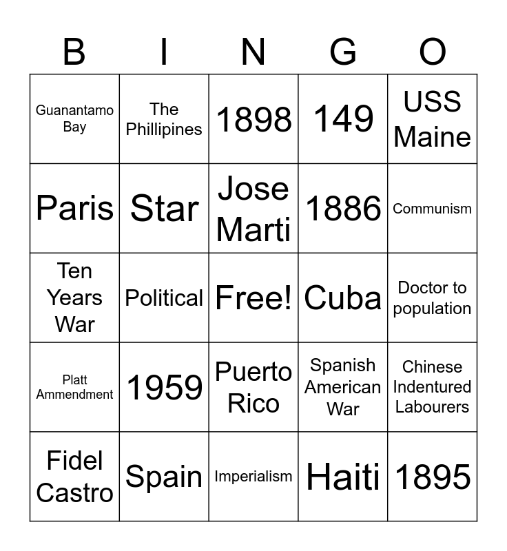 This bingo card has a free space and 24 words: 1959, Spain, Jose Marti, Fidel Castro, USS Maine, Guanantamo Bay, Paris, The Phillipines, Cuba, Puerto Rico, 1886, Ten Years War, Spanish American War, Chinese Indentured Labourers, Star, Haiti, Doctor to population, 1898, Communism, Political, 1895, Platt Ammendment, 149 and Imperialism.