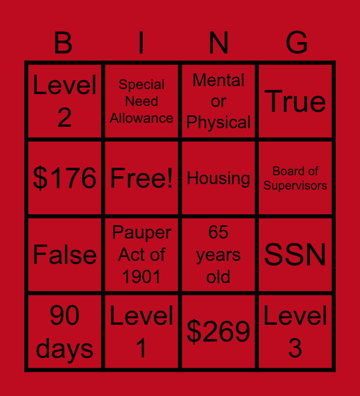 This bingo card has 16 words: Level 1, SSN, Mental or Physical, Level 2, False, Special Need Allowance, 65 years old, $269, $176, Free!, 90 days, True, Pauper Act of 1901, Board of Supervisors, Housing and Level 3.