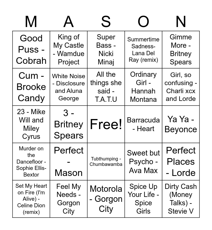 This bingo card has a free space and 50 words: We like to Party - Vengaboys, Dirty Cash (Money Talks) - Stevie V, Girls in the Hood - Meg thee stallion, Motorola - Gorgon City, Perfect - Mason, Be My Lover - La Bouche, King of My Castle - Wamdue Project, Coconuts - Kim Petras, Cum - Brooke Candy, You Spin Me Round - Dead or Alive, White Noise - Disclosure and Aluna George, Summertime Sadness- Lana Del Ray (remix), Perfect Places - Lorde, Sweet but Psycho - Ava Max, Doorman - SlowThai, Losing it - FISHER, All the things she said - T.A.T.U, Barracuda - Heart, WAP - Meg Thee Stallion and Cardi B, Gimme More - Britney Spears, 3 - Britney Spears, Spice Up Your Life - Spice Girls, Good Puss - Cobrah, Ordinary Girl - Hannah Montana, Unbreak My Heart - Toni Braxton, Pocketful of Sunshine - Natasha Bedingfield, Girl, so confusing - Charli xcx and Lorde, Speed Drive (from Barbie Movie) - Charli xcx, Super Bass - Nicki Minaj, Tubthumping - Chumbawamba, If U Seek Amy - Britney Spears, My Neck, My Back - Khia, It's Not Right But It's Okay - Whitney Houston, 100% Pure Love - Crystal Water, Feel My Needs - Gorgon City, NISSAN ALTIMA - Doechii, Throat Goat - Kim Petras, Pump Up The Jam - Techotronic, 212 - Azelia banks, Ya Ya - Beyonce, Judas - Lady Gaga, BOA - Meg Thee Stallion, My Barn, My Rules - HorseGiirL, Not Fair - Lily Allen, Set My Heart on Fire (I'm Alive) - Celine Dion (remix), 23 - Mike Will and Miley Cyrus, Alter Ego - Doechii, A Moment Like This - Leona Lewis, Murder on the Dancefloor - Sophie Ellis-Bextor and Pump It Up - Endor.