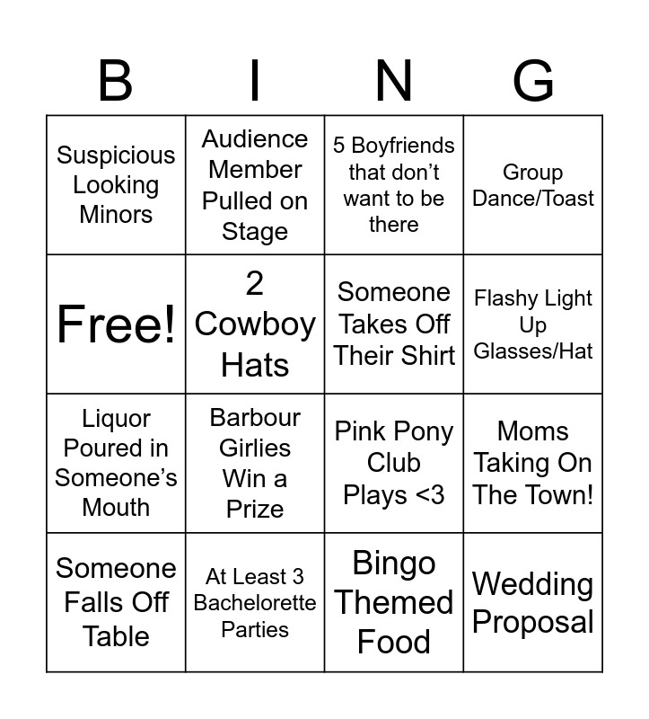 This bingo card has 16 words: At Least 3 Bachelorette Parties, Moms Taking On The Town!, 5 Boyfriends that don’t want to be there, Suspicious Looking Minors, Liquor Poured in Someone’s Mouth, Audience Member Pulled on Stage, Pink Pony Club Plays <3, Bingo Themed Food, Free!, 2 Cowboy Hats, Someone Falls Off Table, Group Dance/Toast, Barbour Girlies Win a Prize, Flashy Light Up Glasses/Hat, Someone Takes Off Their Shirt and Wedding Proposal.