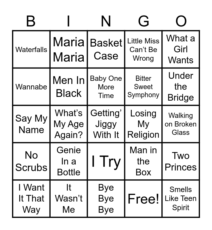 This bingo card has 32 words: Free!, Mambo No. 5, What’s My Age Again?, Livin’ la Vida Loca, No Scrubs, Men In Black, What a Girl Wants, Two Princes, Maria Maria, Smells Like Teen Spirit, Baby One More Time, Basket Case, Meet Virginia, Santeria, Losing My Religion, Torn, I Want It That Way, Say My Name, I Try, Genie In a Bottle, Man in the Box, Daughter, Walking on Broken Glass, It Wasn’t Me, Getting’ Jiggy With It, Little Miss Can’t Be Wrong, Bitter Sweet Symphony, Wannabe, Waterfalls, Bye Bye Bye, Zombies and Under the Bridge.
