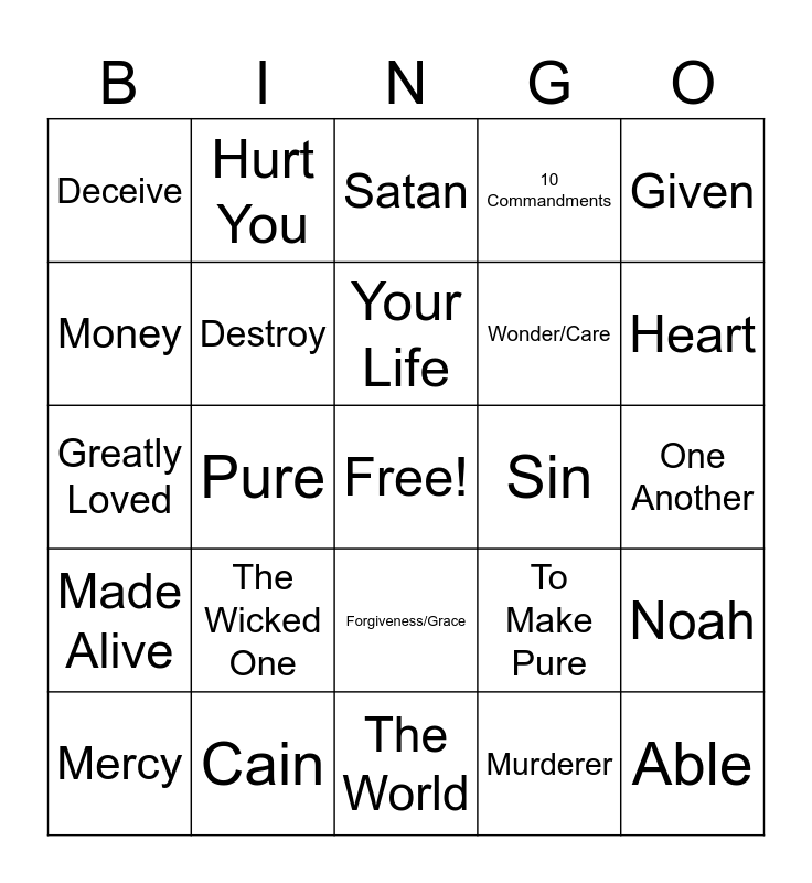 This bingo card has a free space and 29 words: Mercy, Beatitudes, Pure, Jesus, Deceive, Satan, Destroy, The Wicked One, Sin, Cain, One Another, Able, The World, Murderer, Heart, Commandment, Forgiveness/Grace, Made Alive, Given, Greatly Loved, To Make Pure, Passover/Break, Wonder/Care, Money, 10 Commandments, Hurt You, Noah, Your Life and The Best.