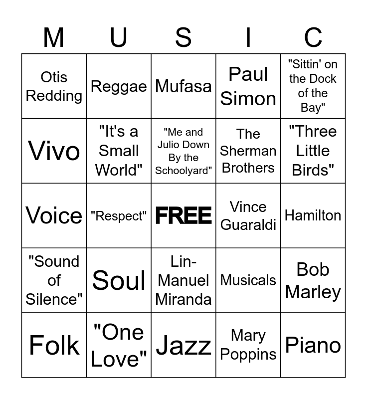 This bingo card has a free space and 29 words: Folk, Soundtracks, "Respect", "Linus and Lucy", Otis Redding, Mufasa, "It's a Small World", Soul, Vince Guaraldi, "One Love", Hamilton, Piano, Jazz, Mary Poppins, "Three Little Birds", Encanto, Lin-Manuel Miranda, "Sound of Silence", "Sittin' on the Dock of the Bay", Voice, Musicals, Rock 'n Roll, The Sherman Brothers, Vivo, Paul Simon, Reggae, Bob Marley, "Me and Julio Down By the Schoolyard" and Guitar.