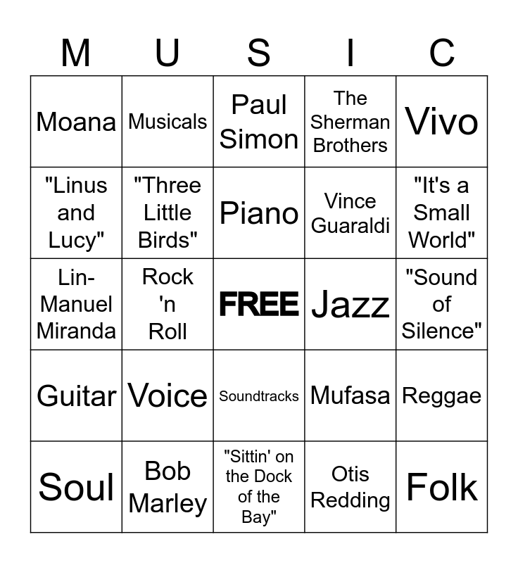 This bingo card has a free space and 24 words: Voice, Bob Marley, Piano, Soul, Vivo, Moana, "Linus and Lucy", Musicals, Jazz, Soundtracks, Vince Guaraldi, Lin-Manuel Miranda, Mufasa, Reggae, "Three Little Birds", Otis Redding, "Sound of Silence", Paul Simon, "It's a Small World", Rock 'n Roll, Folk, Guitar, The Sherman Brothers and "Sittin' on the Dock of the Bay".