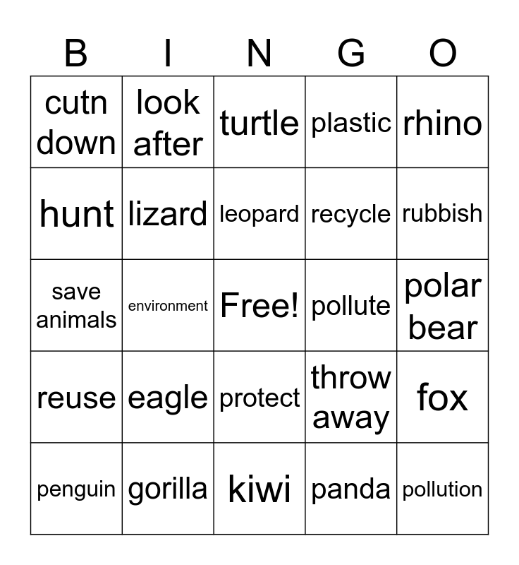 This bingo card has a free space and 24 words: eagle, gorilla, leopard, penguin, rhino, cutn down, hunt, look after, pollute, protect, recycle, save animals, throw away, fox, lizard, panda, polar bear, turtle, rubbish, environment, pollution, reuse, plastic and kiwi.