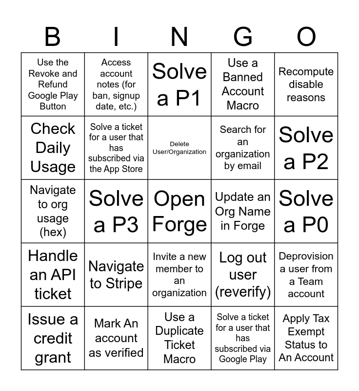This bingo card has a free space and 24 words: Navigate to Stripe, Mark An account as verified, Delete User/Organization, Issue a credit grant, Recompute disable reasons, Use the Revoke and Refund Google Play Button, Check Daily Usage, Access account notes (for ban, signup date, etc.), Update an Org Name in Forge, Invite a new member to an organization, Search for an organization by email, Navigate to org usage (hex), Log out user (reverify), Deprovision a user from a Team account, Solve a ticket for a user that has subscribed via the App Store, Solve a ticket for a user that has subscribed via Google Play, Solve a P0, Solve a P1, Solve a P2, Solve a P3, Apply Tax Exempt Status to An Account, Handle an API ticket, Use a Banned Account Macro and Use a Duplicate Ticket Macro.