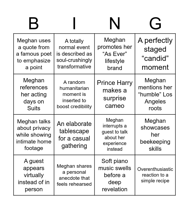 This bingo card has 36 words: Free!, Meghan expresses shock at a guest’s unexpected music taste, Barefoot dancing in the kitchen, Prince Harry makes a surprise cameo, Meghan shares a “life-changing” gardening tip, Overenthusiastic reaction to a simple recipe, Meghan mentions her “humble” Los Angeles roots, Awkward laughter after a guest’s joke falls flat, Meghan references her acting days on Suits, Overuse of the word “authentic”, Meghan showcases her beekeeping skills, A perfectly staged “candid” moment, Excessive praise for a guest’s mundane accomplishment, Meghan shares a personal anecdote that feels rehearsed, An elaborate tablescape for a casual gathering, Meghan uses a quote from a famous poet to emphasize a point, A segment dedicated to Meghan’s dogs, Meghan emphasizes “joy over perfection” while everything looks flawless, A guest appears virtually instead of in person, Meghan promotes her “As Ever” lifestyle brand, Soft piano music swells before a deep revelation, Meghan dramatically pauses mid-sentence as if she’s about to cry, A dramatic metaphor that makes zero sense when you think about it, Meghan presents herself as an expert in a completely new subject, Someone describes Meghan as “inspiring” in an over-the-top way, A totally normal event is described as soul-crushingly transformative, Meghan interrupts a guest to talk about her experience instead, Harry sits quietly in the background, looking vaguely confused, Meghan talks about privacy while showing intimate home footage, A random humanitarian moment is inserted to boost credibility, Meghan references Diana yet again, Someone in your group correctly predicts a line before she says it, A painfully obvious product placement happens, Meghan drops a deep but vague statement with no real meaning, A totally spontaneous moment is clearly pre-planned and Someone in your group sighs and refills their drink.