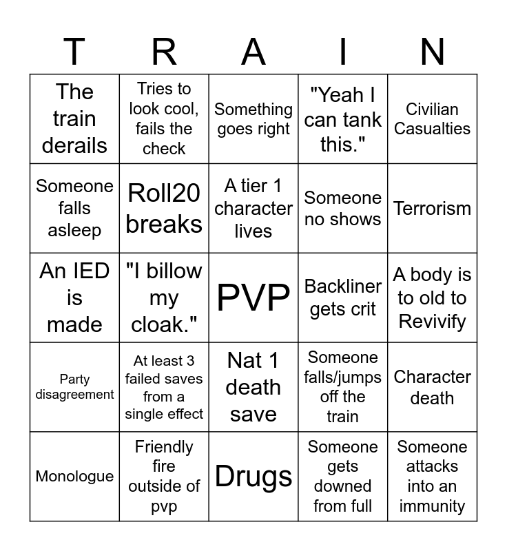 This bingo card has a free space and 24 words: At least 3 failed saves from a single effect, Friendly fire outside of pvp, A tier 1 character lives, Monologue, Civilian Casualties, The train derails, Someone falls asleep, Tries to look cool, fails the check, Backliner gets crit, Nat 1 death save, Someone no shows, An IED is made, Someone falls/jumps off the train, Character death, Roll20 breaks, Someone gets downed from full, A body is to old to Revivify, Something goes right, Terrorism, "I billow my cloak.", Someone attacks into an immunity, Party disagreement, "Yeah I can tank this." and Drugs.