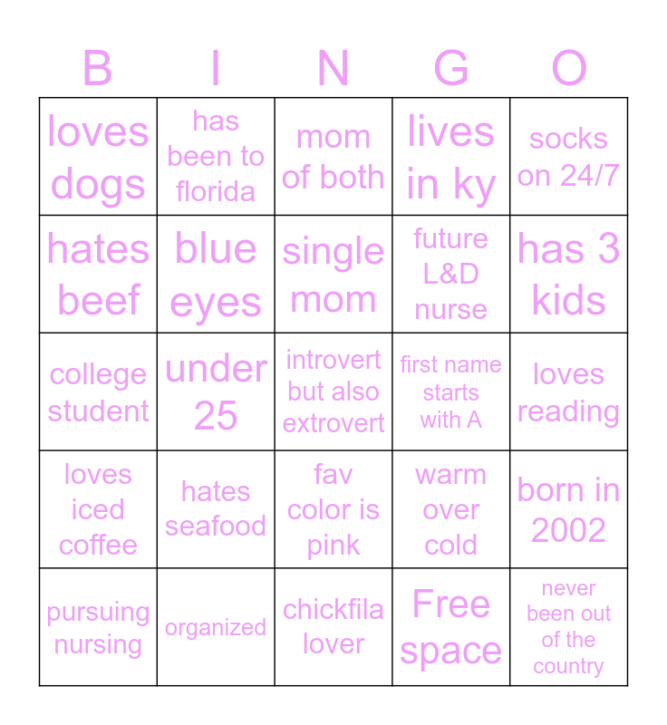This bingo card has 25 words: hates seafood, chickfila lover, single mom, pursuing nursing, socks on 24/7, loves dogs, hates beef, has been to florida, first name starts with A, fav color is pink, future L&D nurse, college student, warm over cold, born in 2002, blue eyes, never been out of the country, loves reading, mom of both, has 3 kids, under 25, introvert but also extrovert, organized, loves iced coffee, lives in ky and Free space.