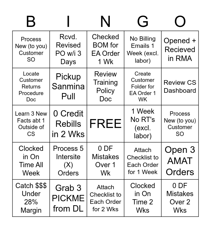 This bingo card has a free space and 24 words: Process 5 Intersite (X) Orders, Grab 3 PICKME from DL, Review Training Policy Doc, Catch $$$ Under 28% Margin, Opened + Recieved in RMA, Process New (to you) Customer SO, Locate Customer Returns Procedure Doc, Rcvd. Revised PO w/i 3 Days, 1 Week No RT's (excl. labor), 0 DF Mistakes Over 1 Wk, Create Customer Folder for EA Order 1 WK, Learn 3 New Facts abt 1 Outside of CS, Attach Checklist to Each Order for 1 Week, Open 3 AMAT Orders, Pickup Sanmina Pull, Clocked in On Time 2 Wks, Process New (to you) Customer SO, Checked BOM for EA Order 1 Wk, Review CS Dashboard, 0 Credit Rebills in 2 Wks, 0 DF Mistakes Over 2 Wks, Clocked in On Time All Week, No Billing Emails 1 Week (excl. labor) and Attach Checklist to Each Order for 2 Wks.