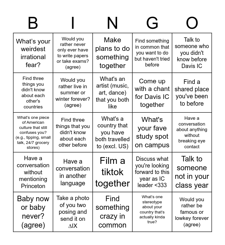 This bingo card has 25 words: Have a conversation in another language, Find something crazy in common, What's an artist (music, art, dance) that you both like, Baby now or baby never? (agree), Talk to someone who you didn't know before Davis IC, What’s your weirdest irrational fear?, Find three things you didn't know about each other's countries, Would you rather never only ever have to write papers or take exams? (agree), What's your fave study spot on campus, Film a tiktok together, Come up with a chant for Davis IC together, What’s one piece of American culture that still confuses you? (e.g., tipping, small talk, 24/7 grocery stores), Discuss what you're looking forward to this year as IC leader <333, Talk to someone not in your class year, Would you rather live in summer or winter forever? (agree), Would you rather be famous or lowkey forever (agree), Have a conversation about anything without breaking eye contact, Make plans to do something together, Find a shared place you've been to before, Find three things that you didn't know about each other before, What's a country that you have both travelled to (excl. US), Take a photo of you two posing and send it on ∆IX, Have a conversation without mentioning Princeton, Find something in common that you want to do but haven't tried before and What’s one stereotype about your country that’s actually kinda true?.