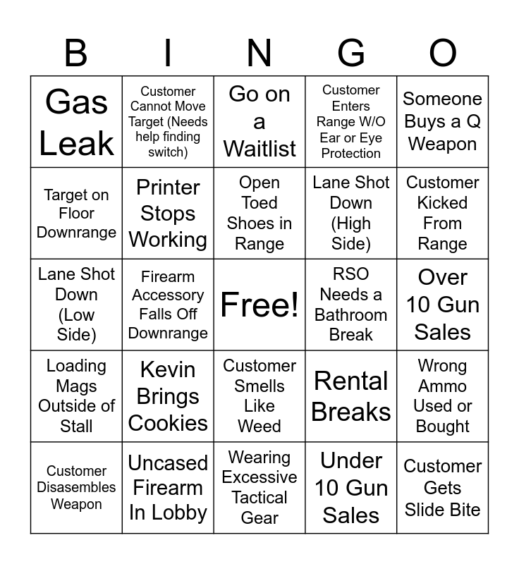 This bingo card has a free space and 24 words: Kevin Brings Cookies, Uncased Firearm In Lobby, Open Toed Shoes in Range, Customer Disasembles Weapon, Someone Buys a Q Weapon, Gas Leak, Target on Floor Downrange, Customer Cannot Move Target (Needs help finding switch), RSO Needs a Bathroom Break, Customer Smells Like Weed, Lane Shot Down (High Side), Lane Shot Down (Low Side), Rental Breaks, Wrong Ammo Used or Bought, Printer Stops Working, Under 10 Gun Sales, Over 10 Gun Sales, Go on a Waitlist, Customer Kicked From Range, Firearm Accessory Falls Off Downrange, Customer Gets Slide Bite, Loading Mags Outside of Stall, Customer Enters Range W/O Ear or Eye Protection and Wearing Excessive Tactical Gear.