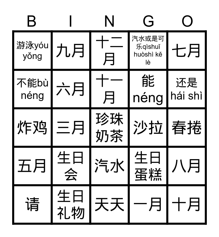 生日会(中佛州学校) | 生日会(中佛州学校) | Write down the pinyin without tones of each word. | Chinese Dates 三四年级 | ZB1-U2LC-BasicVocab-CharacterBingo