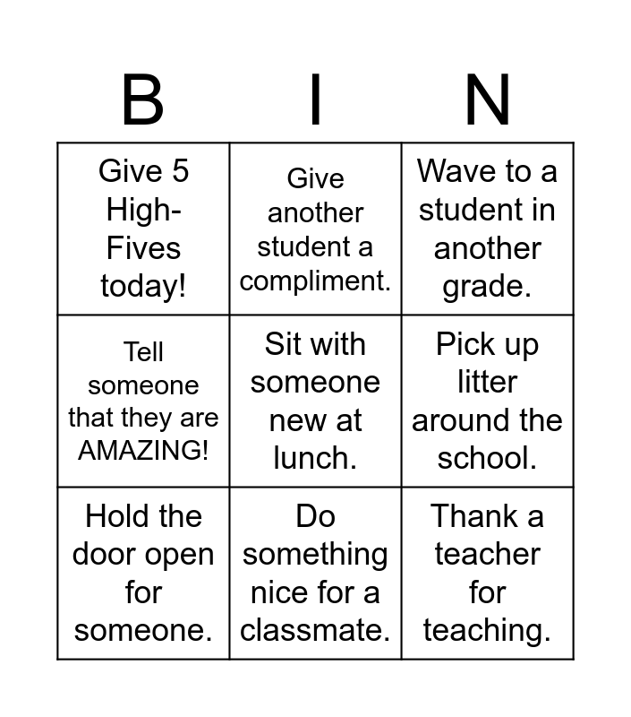 This bingo card has a free space and 8 words: Pick up litter around the school., Wave to a student in another grade., Give another student a compliment., Hold the door open for someone., Give 5 High-Fives today!, Thank a teacher for teaching., Tell someone that they are AMAZING! and Do something nice for a classmate..