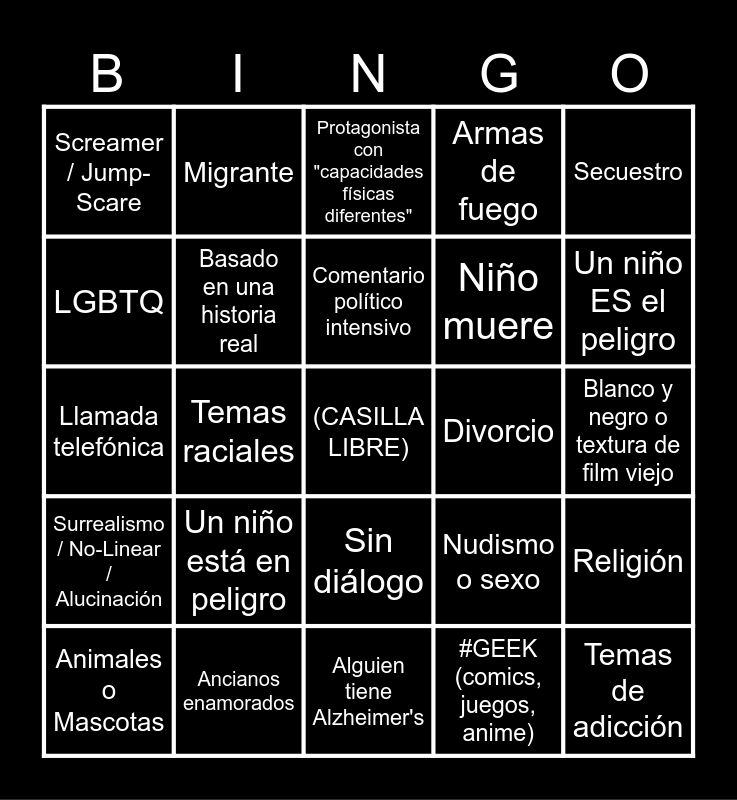 This bingo card has a free space and 25 words: Un niño está en peligro, Alguien tiene Alzheimer's, Comentario político intensivo, Animales o Mascotas, Secuestro, Screamer / Jump-Scare, LGBTQ, Migrante, Divorcio, Sin diálogo, Niño muere, Llamada telefónica, Nudismo o sexo, Religión, Basado en una historia real, El protagonista es un artista, Blanco y negro o textura de film viejo, Protagonista con "capacidades físicas diferentes", Un niño ES el peligro, Temas raciales, Temas de adicción, Ancianos enamorados, Surrealismo / No-Linear / Alucinación, Armas de fuego and #GEEK (comics, juegos, anime).