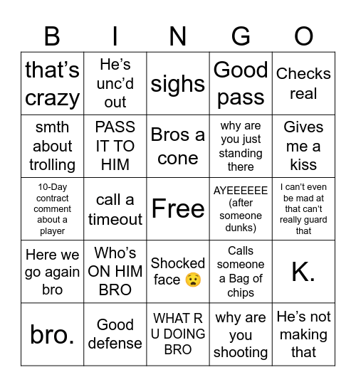 This bingo card has a free space and 24 words: Who’s ON HIM BRO, Good defense, Bros a cone, bro., Checks real, that’s crazy, smth about trolling, He’s unc’d out, AYEEEEEE (after someone dunks), Shocked face 😧, why are you just standing there, 10-Day contract comment about a player, Calls someone a Bag of chips, K., PASS IT TO HIM, why are you shooting, I can’t even be mad at that can’t really guard that, sighs, Gives me a kiss, call a timeout, He’s not making that, Here we go again bro, Good pass and WHAT R U DOING BRO.