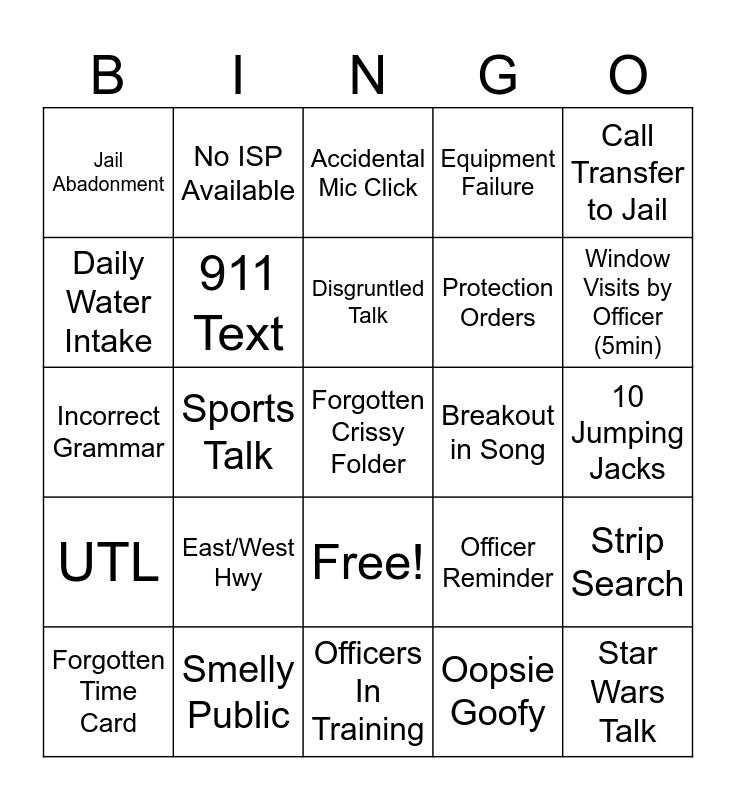 This bingo card has 43 words: DWO, Forgotten Crissy Folder, Random Weather Talk, Forgotten Time Card, SOP Review (10), Oopsie Goofy, Accidental Mic Click, Laughter Tears, Call Transfer to Jail, Smelly Public, Equipment Failure, Breakout in Song, Free!, East/West Hwy, Random Movie Quote, Officers In Training, No ITD Available, Incorrect Grammar, Validations, Window Visits by Officer (5min), No ISP Available, Emails from Admin, Vehicle Talk, Jail Abadonment, IAED Training, 10 Jumping Jacks, Dusting, Open Cases, Officer Reminder, UTL, Nickname Used, Strip Search, DHW Email, Sports Talk, Giggles, Officer Call Out, Star Wars Talk, Disgruntled Talk, Daily Water Intake, Protection Orders, Warrants, 911 Text and Frequent Flyer.