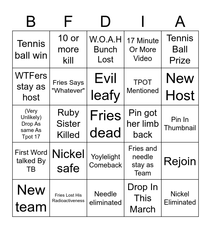 This bingo card has 25 words: Nickel safe, Needle eliminated, Evil leafy, New team, Tennis Ball Prize, Tennis ball win, WTFers stay as host, 10 or more kill, Pin got her limb back, Yoylelight Comeback, TPOT Mentioned, (Very Unlikely) Drop As same As Tpot 17, Fries and needle stay as Team, Rejoin, Fries Says "Whatever", Nickel Eliminated, Pin In Thumbnail, W.O.A.H Bunch Lost, New Host, Ruby Sister Killed, Fries dead, Fries Lost His Radioactiveness, First Word talked By TB, 17 Minute Or More Video and Drop In This March.