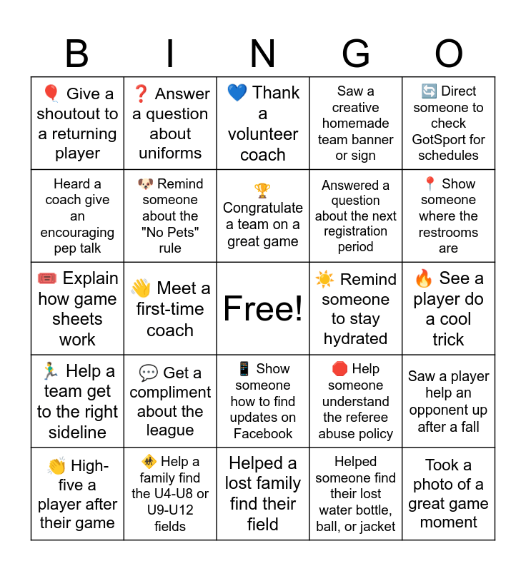 This bingo card has a free space and 33 words: ✅ Help a lost parent find their field, 🎤 Answer a rule-related question, 👋 Meet a first-time coach, ⚽ See a player score a goal, 🏃♂️ Help a team get to the right sideline, 🐶 Remind someone about the "No Pets" rule, 🔄 Direct someone to check GotSport for schedules, 👏 High-five a player after their game, ❓ Answer a question about uniforms, 📸 Take a pic with a coach or team, 🏆 Congratulate a team on a great game, 💙 Thank a volunteer coach, 🌟 Give words of encouragement to a new player, 🥅 Direct a team to the correct goal, ☀️ Remind someone to stay hydrated, 📍 Show someone where the restrooms are, 🚸 Help a family find the U4-U8 or U9-U12 fields, 🎟️ Explain how game sheets work, 💬 Get a compliment about the league, 🛑 Help someone understand the referee abuse policy, 📱 Show someone how to find updates on Facebook, 🤩 Spot a player wearing crazy socks, 🎈 Give a shoutout to a returning player, 🔥 See a player do a cool trick, Helped a lost family find their field, Took a photo of a great game moment, Saw a creative homemade team banner or sign, Answered a question about the next registration period, Heard a coach give an encouraging pep talk, Saw a player help an opponent up after a fall, Helped a referee with a question or issue, Helped someone find their lost water bottle, ball, or jacket and Saw a younger sibling playing with a soccer ball on the sidelines.