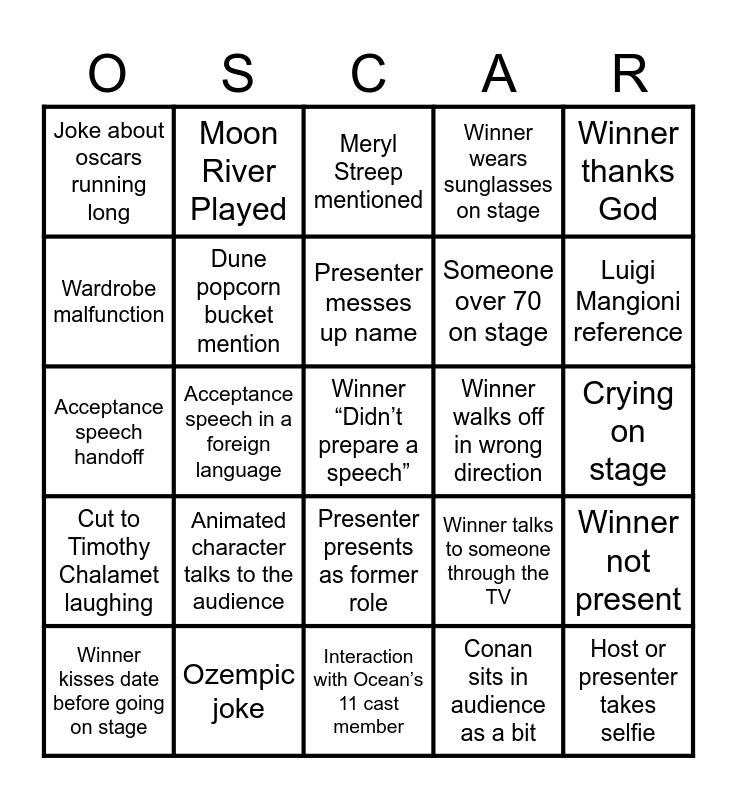 This bingo card has 50 words: Scantily clad outfit on stage, Winner “Didn’t prepare a speech”, Had noticeable work done for the Oscars, Interaction with Ocean’s 11 cast member, Animated character talks to the audience, Disney song played, Moon River Played, Music from La La Land, Wardrobe malfunction, Joke about Joker 2 flopping, Dune popcorn bucket mention, Winner wears sunglasses on stage, Winner not present, Winner talks to someone through the TV, Censored profanity, Technical error, Presenter messes up name, Winner walks off in wrong direction, Winner stumbles getting on stage, Winner thanks God, Acceptance speech in a foreign language, Conan sits in audience as a bit, Joke about oscars running long, Someone over 70 on stage, Host or presenter sings, Host or presenter takes selfie, Luigi Mangioni reference, Gen Z slang used by non-Gen Zer, Meryl Streep mentioned, Presenter presents as former role, AI joke, Will Smith slap joke, Mention of Kendrick v Drake beef, Diddy joke, Ozempic joke, Conan makes fun of Emilia Perez, Joke about Brutalist run time, First time oscar winner, Winner “shares” award with other nominees, Crying on stage, Anyone mentions politics, Winner thanks cast and crew, Conan outfit change, Winner thanks the academy, Winner kisses date before going on stage, Acceptance speech handoff, Blake Lively drama referenced, Music plays off winner, Cut to Timothy Chalamet laughing and More than 15 people on stage at once.