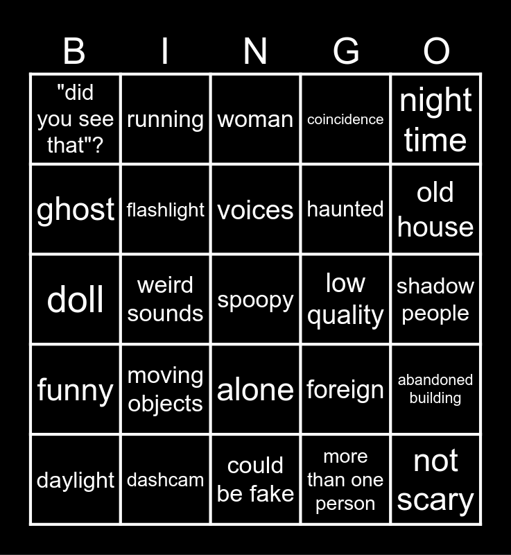 This bingo card has a free space and 24 words: moving objects, dashcam, voices, daylight, night time, "did you see that"?, ghost, running, low quality, alone, haunted, doll, foreign, abandoned building, flashlight, more than one person, shadow people, woman, old house, weird sounds, not scary, funny, coincidence and could be fake.