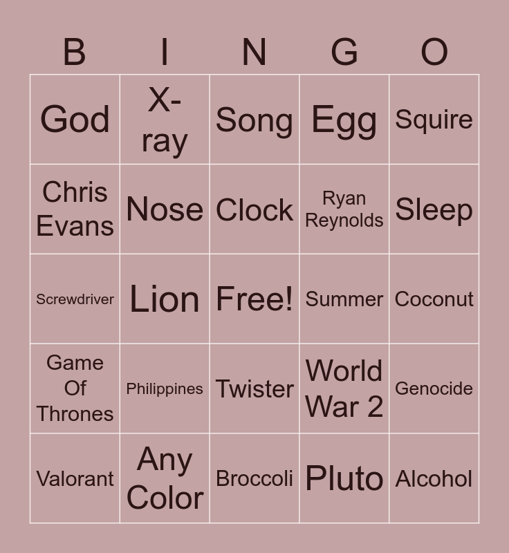 This bingo card has a free space and 24 words: Valorant, Philippines, Clock, Pluto, Squire, God, X-ray, Song, Summer, Coconut, Screwdriver, Nose, World War 2, Genocide, Chris Evans, Any Color, Broccoli, Egg, Sleep, Game Of Thrones, Lion, Twister, Ryan Reynolds and Alcohol.