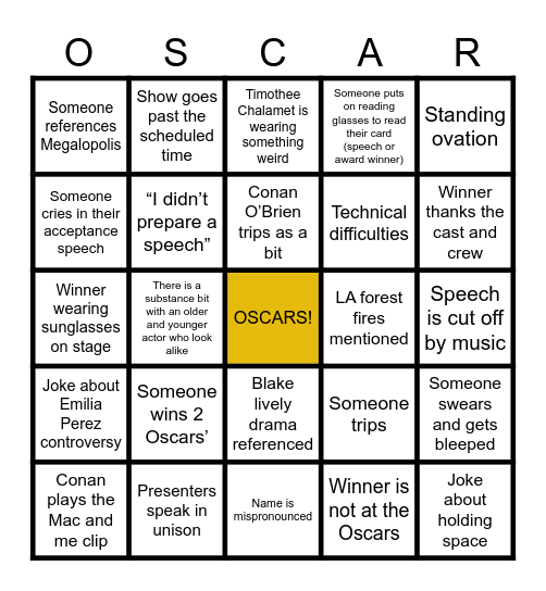 This bingo card has a free space and 24 words: Someone wins 2 Oscars’, Presenters speak in unison, Conan O’Brien trips as a bit, Conan plays the Mac and me clip, Standing ovation, Someone references Megalopolis, Someone cries in their acceptance speech, Show goes past the scheduled time, LA forest fires mentioned, Blake lively drama referenced, Technical difficulties, Winner wearing sunglasses on stage, Someone trips, Someone swears and gets bleeped, “I didn’t prepare a speech”, Winner is not at the Oscars, Speech is cut off by music, Timothee Chalamet is wearing something weird, Winner thanks the cast and crew, There is a substance bit with an older and younger actor who look alike, Joke about holding space, Joke about Emilia Perez controversy, Someone puts on reading glasses to read their card (speech or award winner) and Name is mispronounced.