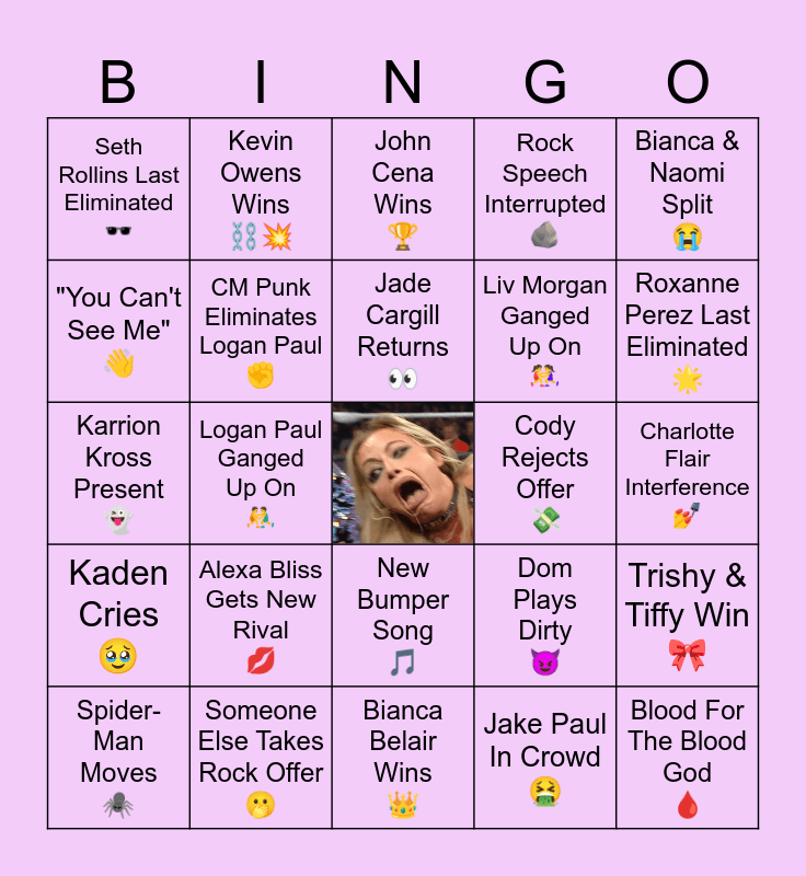 This bingo card has a free space and 24 words: Spider-Man Moves 🕷️, Alexa Bliss Gets New Rival 💋, Jade Cargill Returns 👀, Jake Paul In Crowd 🤮, Bianca & Naomi Split 😭, Seth Rollins Last Eliminated 🕶️, Kevin Owens Wins ⛓️💥, John Cena Wins 🏆, Cody Rejects Offer 💸, Charlotte Flair Interference 💅, Karrion Kross Present 👻, CM Punk Eliminates Logan Paul ✊, Dom Plays Dirty 😈, Trishy & Tiffy Win 🎀, "You Can't See Me" 👋, Someone Else Takes Rock Offer 🫢, Bianca Belair Wins 👑, Rock Speech Interrupted 🪨, Roxanne Perez Last Eliminated 🌟, Kaden Cries 🥹, Logan Paul Ganged Up On 🤼♂️, New Bumper Song 🎵, Liv Morgan Ganged Up On 🤼♀️ and Blood For The Blood God 🩸.