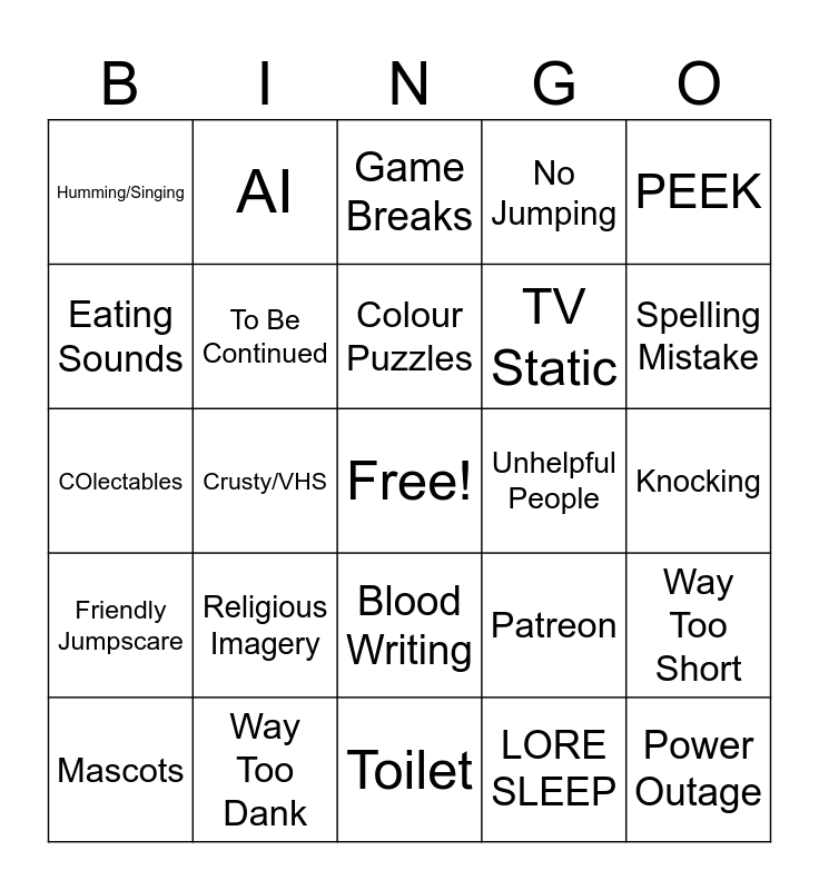 This bingo card has a free space and 24 words: Religious Imagery, Way Too Dank, Colour Puzzles, Mascots, PEEK, Humming/Singing, Eating Sounds, AI, Unhelpful People, Blood Writing, TV Static, COlectables, Patreon, Way Too Short, To Be Continued, LORE SLEEP, Knocking, Game Breaks, Spelling Mistake, Crusty/VHS, Power Outage, Friendly Jumpscare, No Jumping and Toilet.