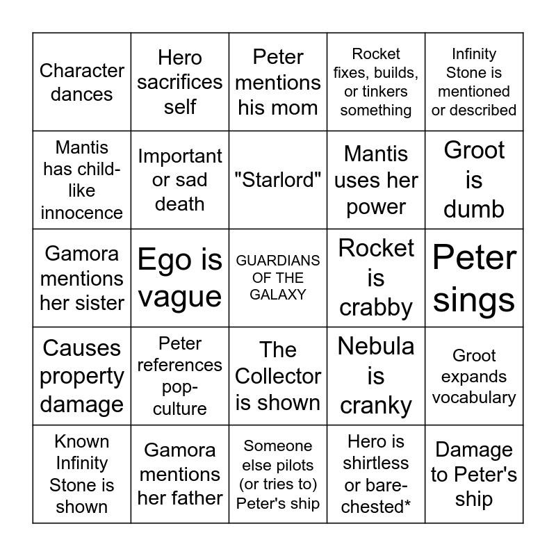 This bingo card has a free space and 34 words: Stan Lee cameo, Hero is shirtless or bare-chested*, We learn the truth about a character, Peter kisses a love interest, Causes property damage, Important or sad death, Infinity Stone is mentioned or described, Known Infinity Stone is shown, Hero sacrifices self, Walkman referenced, "Starlord", Peter mentions his mom, Peter is goofy, Drax doesn't get sarcasm or figurative speech, Rocket is crabby, Groot is dumb, Gamora mentions her father, Gamora mentions her sister, Peter references pop-culture, Nebula is cranky, The Collector is shown, Yondu is mean to Peter, Character dances, Peter sings, Someone else pilots (or tries to) Peter's ship, Damage to Peter's ship, Rocket fixes, builds, or tinkers something, Drax unknowingly insults someone, Mantis uses her power, Mantis has child-like innocence, Ego creates something, Ego is vague, Groot expands vocabulary and Rocket is sensitive about his past.