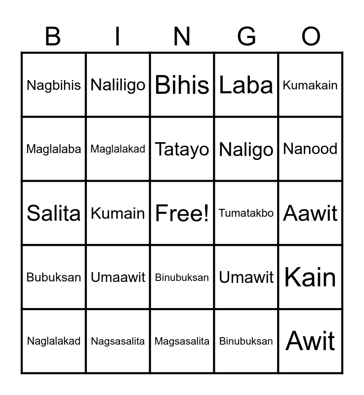 This bingo card has a free space and 24 words: Umaawit, Nagsasalita, Tatayo, Naglalakad, Kumakain, Nagbihis, Maglalaba, Naliligo, Tumatakbo, Binubuksan, Naligo, Salita, Umawit, Kain, Maglalakad, Binubuksan, Aawit, Bihis, Nanood, Kumain, Awit, Bubuksan, Laba and Magsasalita.