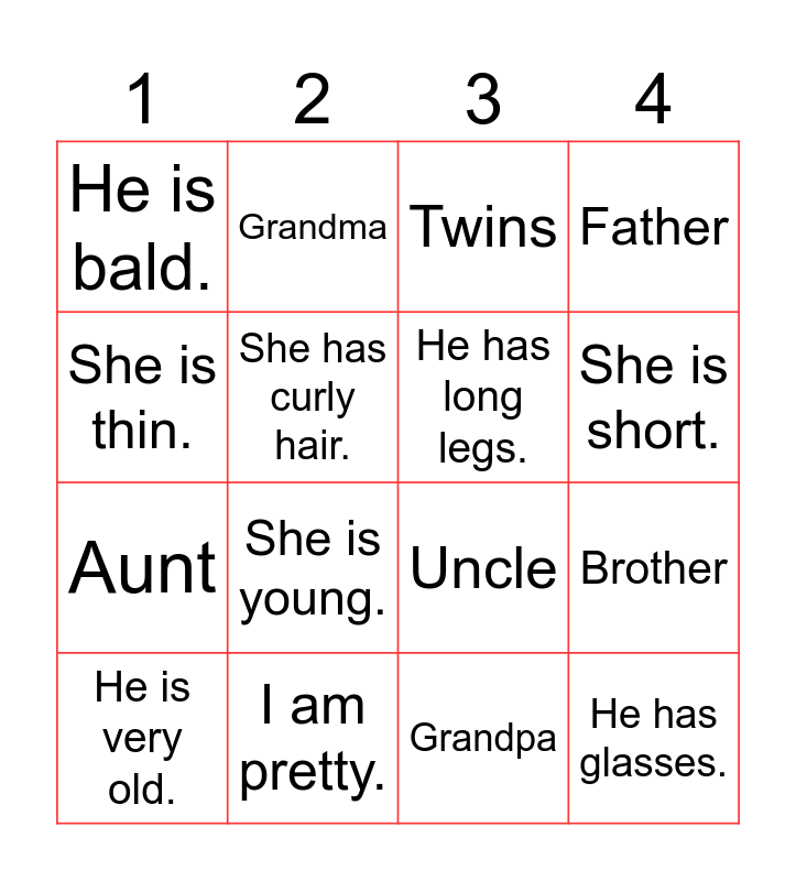 This bingo card has 26 words: Free!, He is tall., She is short., He is fat., She is thin., He is bald., She has curly hair., Grandma, Grandpa, He has straight hair., Aunt, Uncle, Cousin, Sister, Brother, Mother, Father, He has glasses., Twins, He is very old., She is young., I am handsome., I am pretty., She has big eyes., He has long legs. and They have short arms..