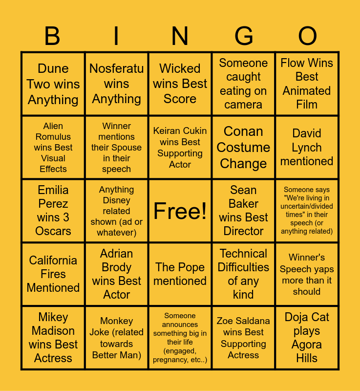 This bingo card has a free space and 24 words: Mikey Madison wins Best Actress, Adrian Brody wins Best Actor, Keiran Cukin wins Best Supporting Actor, Zoe Saldana wins Best Supporting Actress, Flow Wins Best Animated Film, Dune Two wins Anything, Nosferatu wins Anything, Wicked wins Best Score, Sean Baker wins Best Director, Someone says "We're living in uncertain/divided times" in their speech (or anything related), Emilia Perez wins 3 Oscars, Winner mentions their Spouse in their speech, Technical Difficulties of any kind, Winner's Speech yaps more than it should, Alien Romulus wins Best Visual Effects, Monkey Joke (related towards Better Man), Someone announces something big in their life (engaged, pregnancy, etc..), Someone caught eating on camera, David Lynch mentioned, California Fires Mentioned, Anything Disney related shown (ad or whatever), The Pope mentioned, Conan Costume Change and Doja Cat plays Agora Hills.